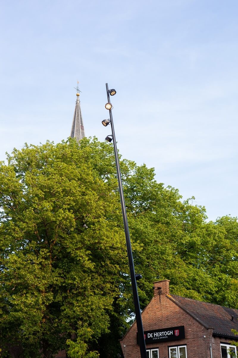 De 4 hoge masten zorgen voor de leesbaarheid van het plein na zonsondergang waardoor beleving en een gevoel van sociale veiligheid ontstaat. De hoek waaronder de mast werd geplaatst komt overeen met de schuinte van het dak van de kerktoren. Door de masten onder een hoek te plaatsen moeten de spots minder gekanteld worden en wordt de lichthinder en verblinding beperkt.